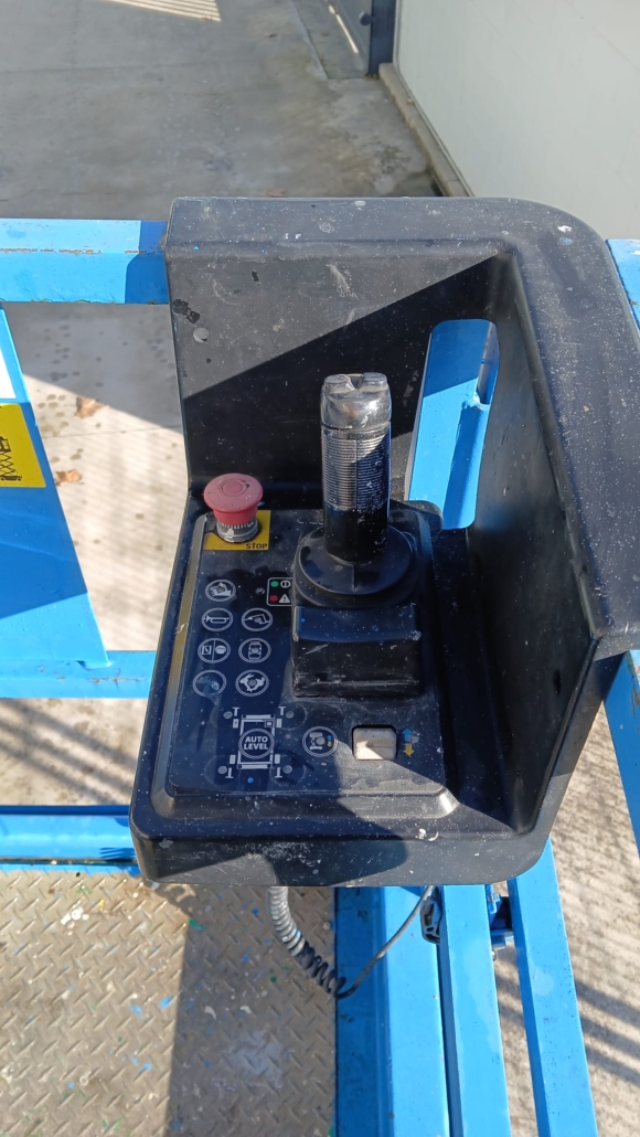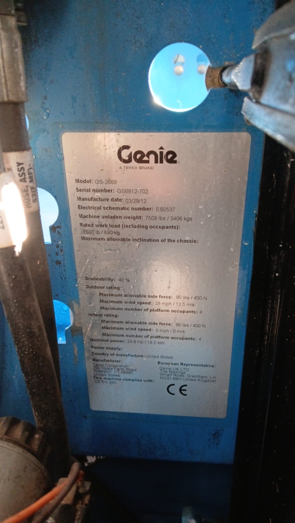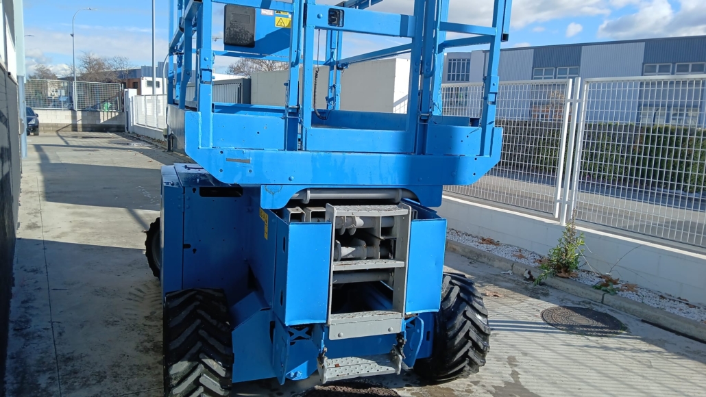 Plataforma de tijera diesel Genie GS-2669-RT compacta. 10 m. altura máxima de trabajo. 1 extensión de 1,52 m., tracción 4x2, capacidad máxima 680 Kg. En buen estado. Revisada de mecánica y mantenimiento