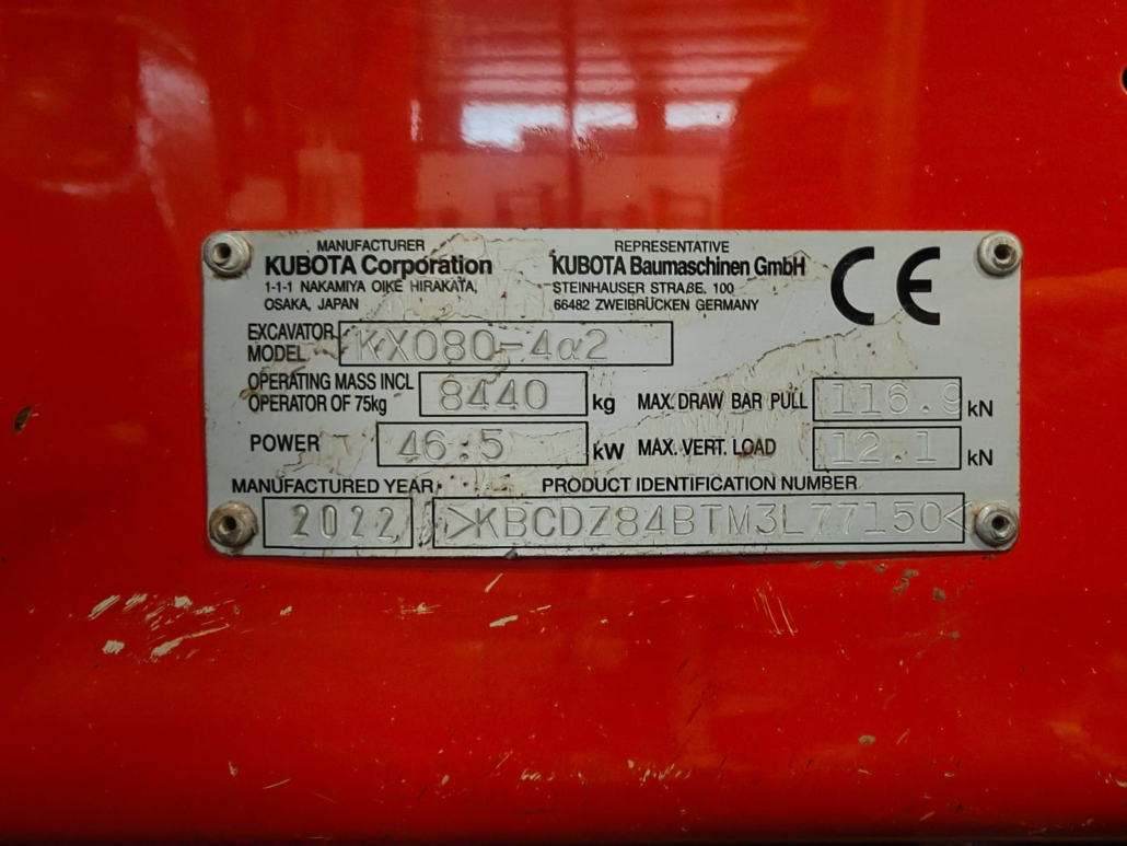 Mini excavadora Kubota KX080-4α2. 8 Tn de peso 5. A/A, rodaje de goma nuevo, balancín largo, enganche rápido, 3 cazos. Revisada de mecánica y mantenimiento
