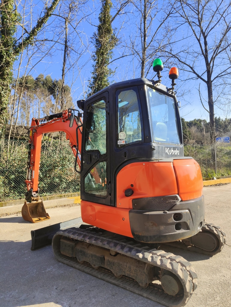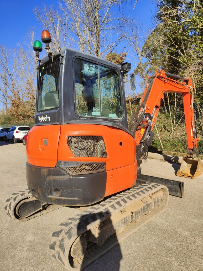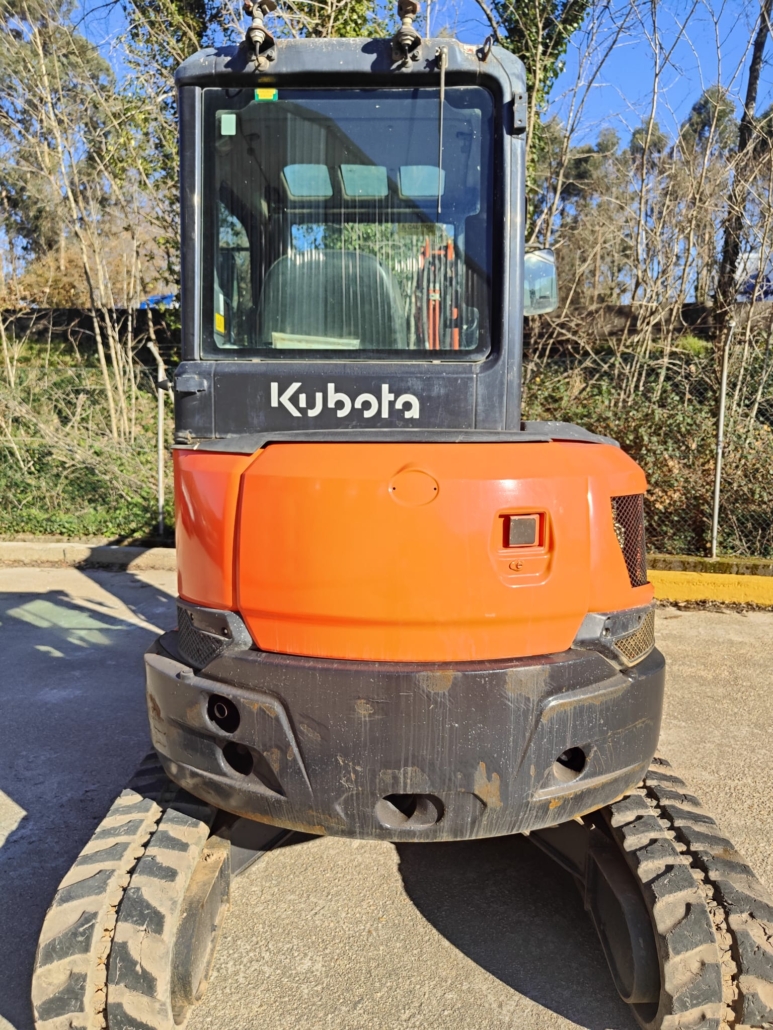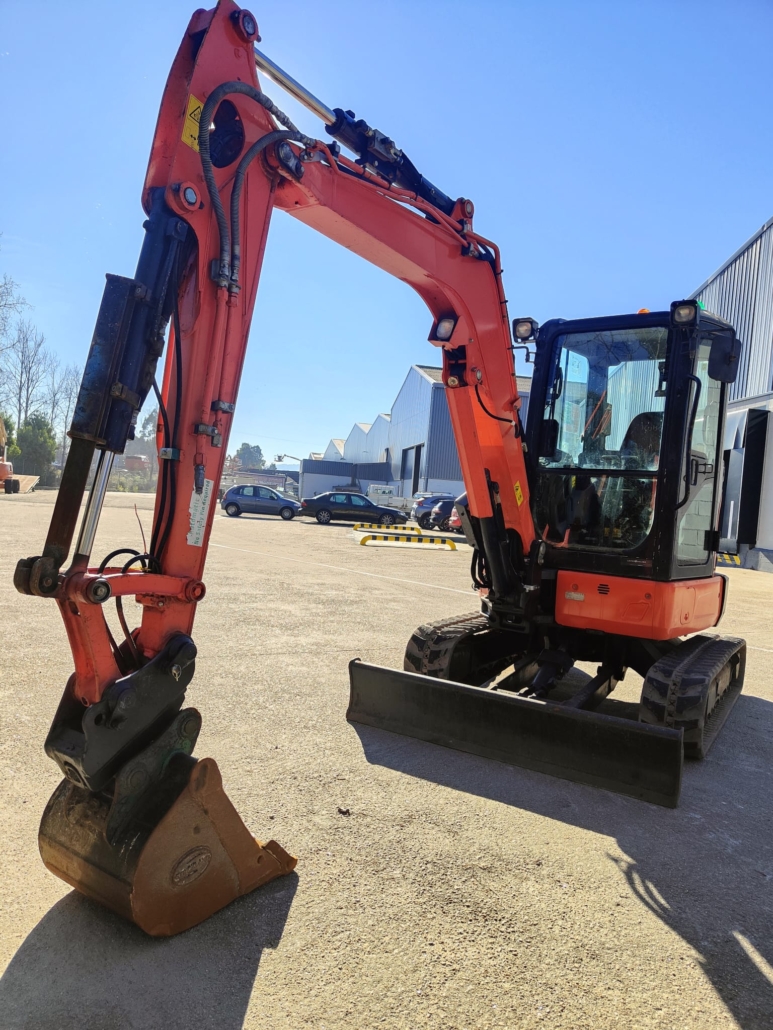 Mini excavadora Kubota U56-5. 3,6 TN de peso. Cabina, A/A, rodaje de goma, balancín largo, enganche rápido, 3 cazos. Revisada de mecánica y mantenimiento
