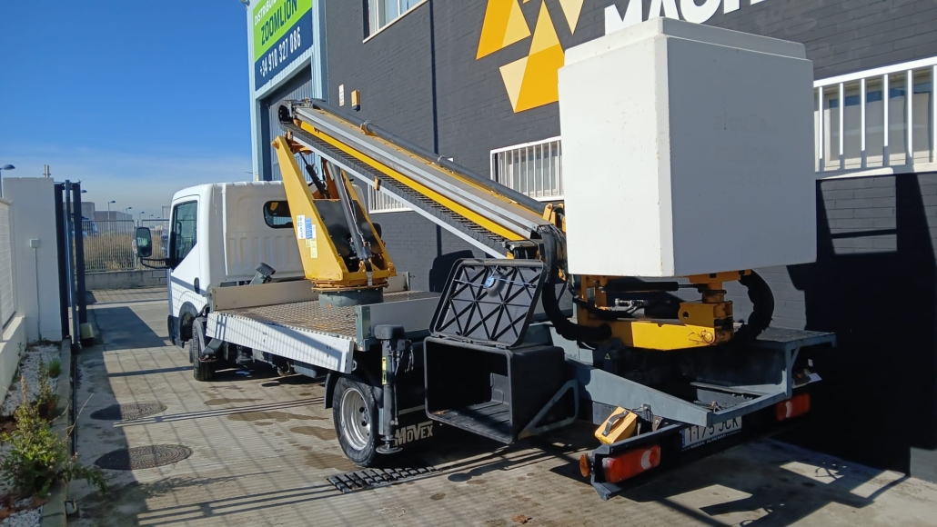 Plataforma telescópica sobre camión diesel Nissan NT400 Cabstar / Movex P160TLR. 16 m. de altura máxima de trabajo. Tracción 4x2, capacidad máxima 200 Kg. 4 estabilizadores. En buen estado. Revisada de mecánica y mantenimiento