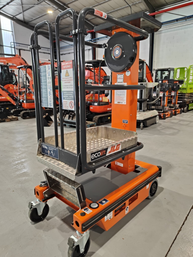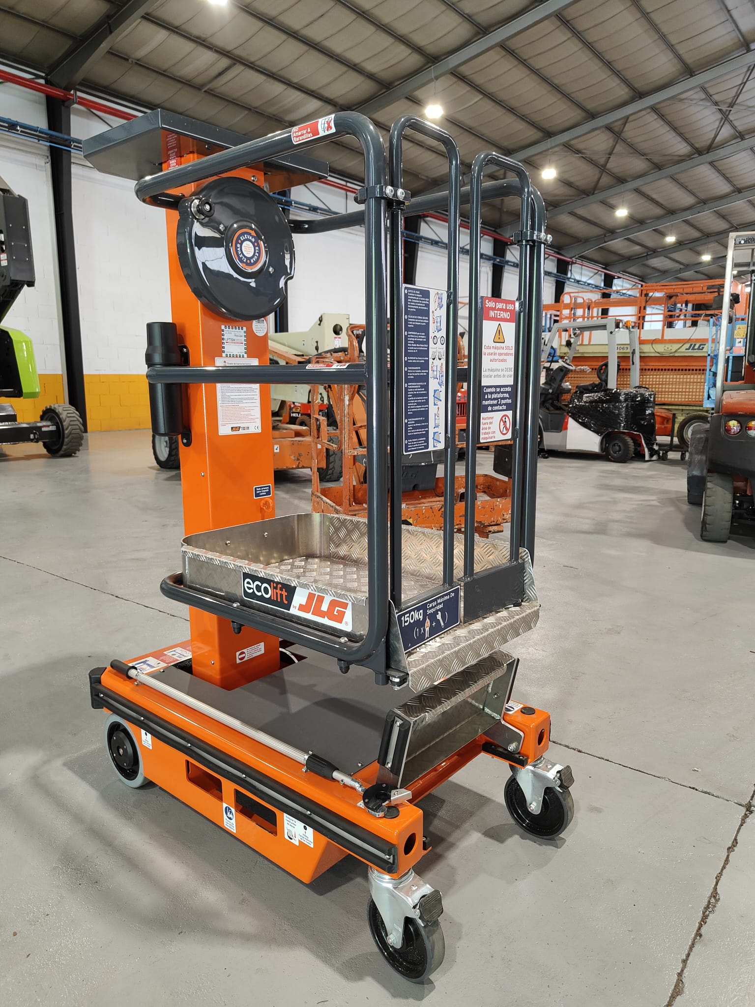Elevador unipersonal manual Power Tower Ecolift, 4,20 m. de altura máxima de trabajo. Carga máxima 150 Kg. Ruedas no marcantes. Freno de autobloqueo al elevarse. Ciclos de elevación ilimitados. Ideal para trabajos de mantenimiento y uso en almacenes.