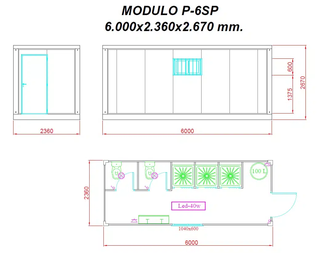 Caseta de obra Precusa P-6PS. Módulo prefabricado sanitario 6 metros, con dos inodoros o placas turcas, tres duchas, lavabo y termo de 100 litros, posibilidad de variaciones según preferencias de cliente