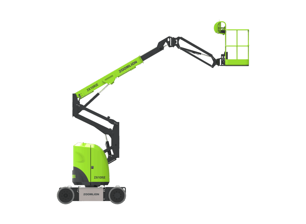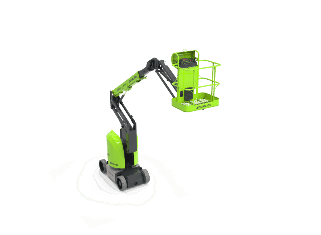 Plataforma articulada eléctrica Zoomlion ZA10RJE. 11,55 m. de altura máxima de trabajo. Carga máxima 230 Kg. Neumáticos no marcantes. Pendiente superable 35 %. Rotación torreta 355°. Pendiente trabajo máxima 3°.