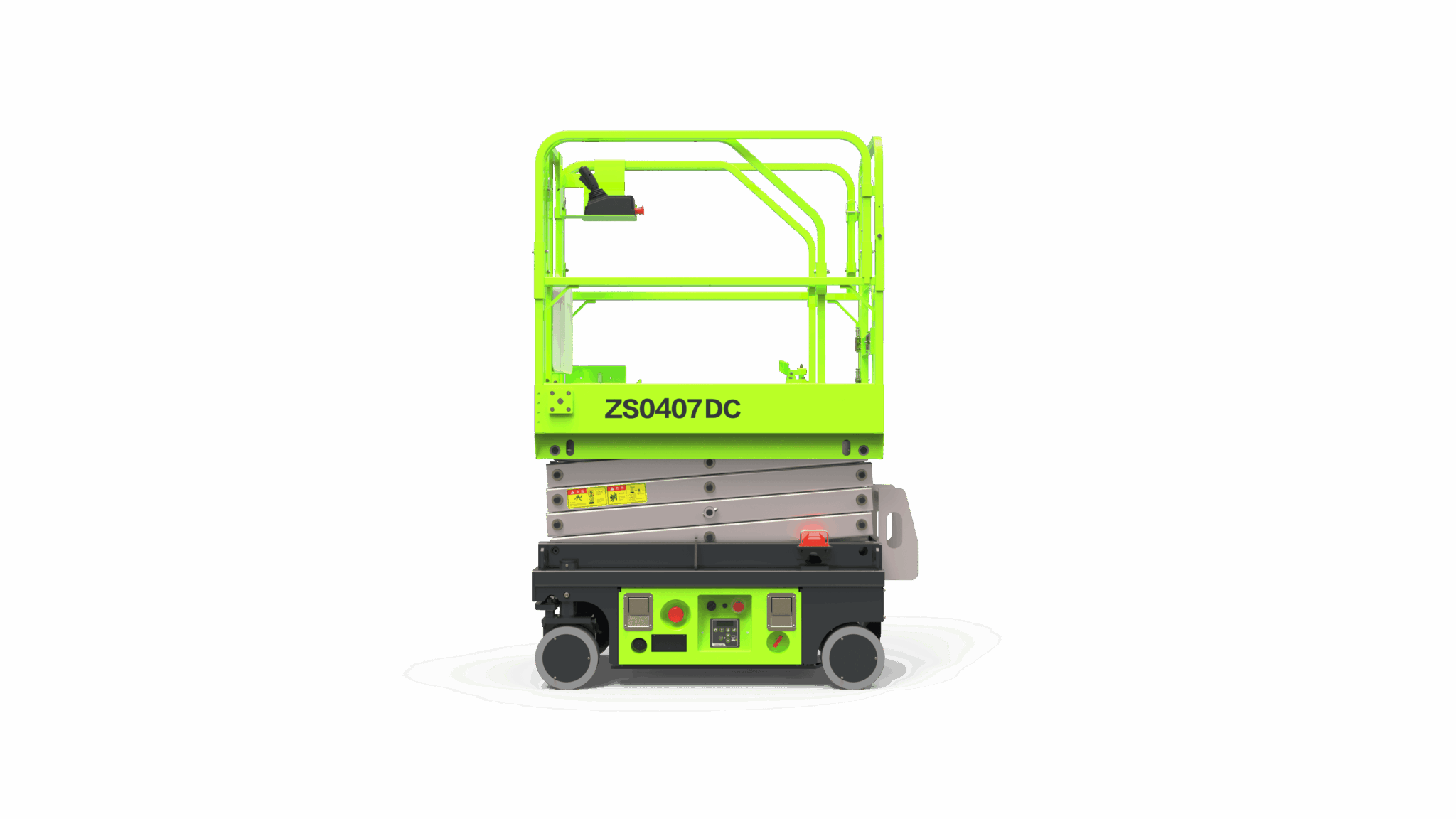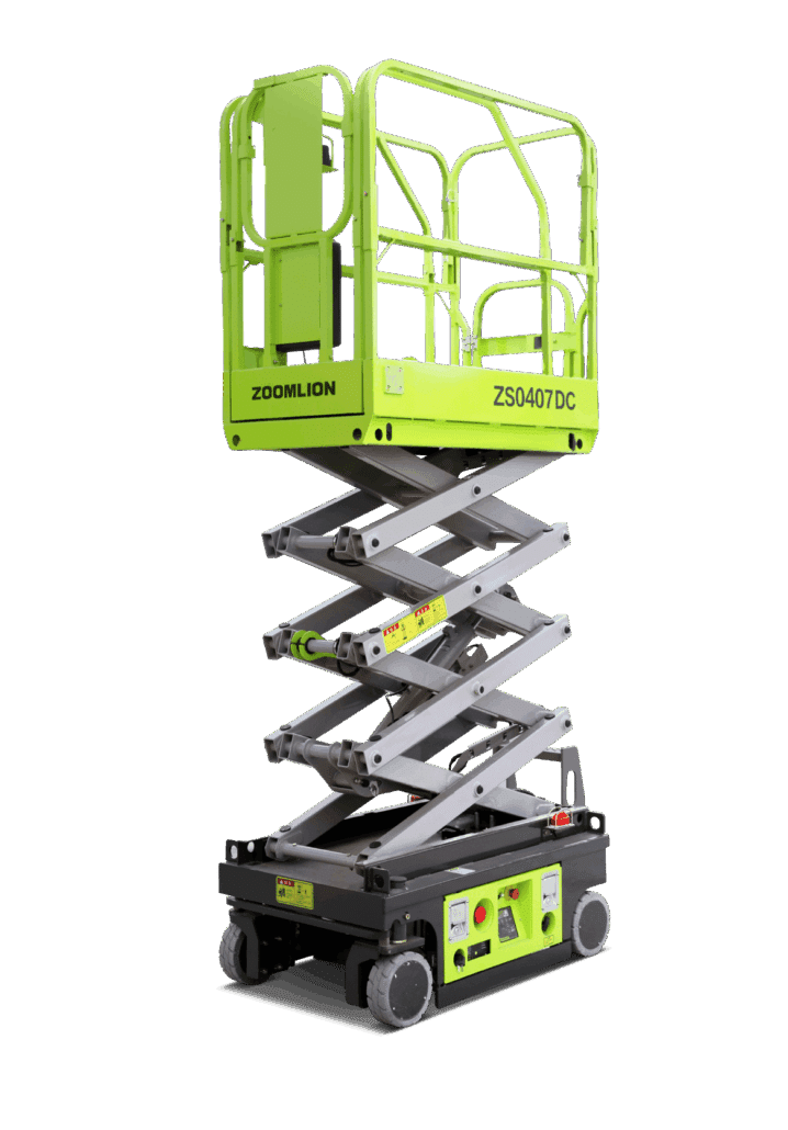 Plataforma tijera eléctrica Zoomlion ZS0407DC, 6,5 m. de altura máxima de trabajo. Carga máxima 240 Kg. Extensible. Carga máxima en la extensión 100 Kg. Neumáticos no marcantes. Freno rueda trasera. Posibilidad batería de Litio. Ideal para espacios reducidos
