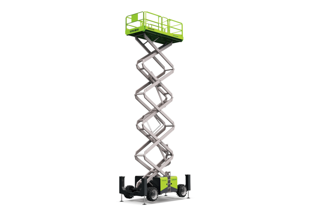 Tijera compacta diésel Zoomlion ZS1623RT. 18 m. de altura máxima de trabajo. Carga máxima 680 Kg. Extensible. Carga máxima en extensión 230 Kg. Neumáticos rellenos de espuma. Motor Kubota o Weichai. Hasta 4 trabajadores a la vez. Nivelación automática.