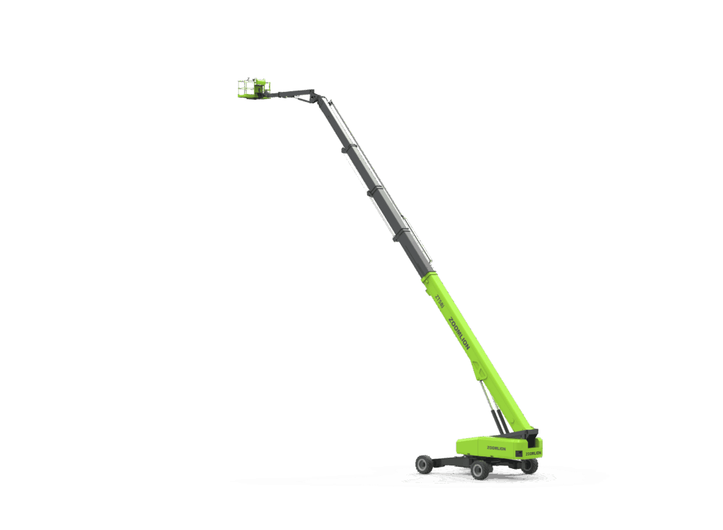 Plataforma telescópica diésel Zoomlion ZT58J. 58,8 m. de altura máxima de elevación. Carga máxima 454 Kg. Neumáticos rellenos de espuma. Pendiente superable 45%. Rotación torreta 360° continua. Motor Cumins, dirección en las 4 ruedas tipo cangrejo.