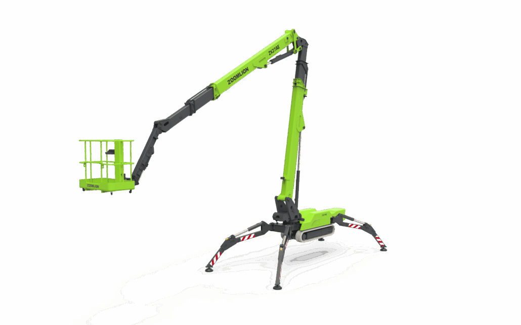 Plataforma araña eléctrica Zoomlion ZX27AE. 27 m. de altura máxima de elevación. Carga máxima 200 Kg. Oruga de caucho no marcante. Pendiente superable 30% a 16.7º. Rotación torreta 400° no continuo. Motor de CA de gran potencia.